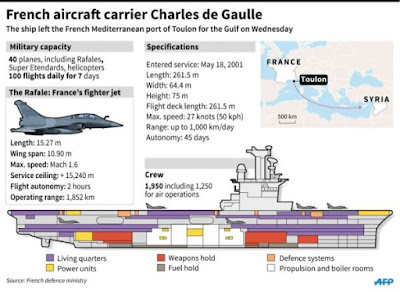 On July 13, 2016 the Associated Press (AP) 7:22 PM EDT reported: PARIS (AP) -- President Francois Hollande has announced that France will redeploy the Charles de Gaulle aircraft carrier this fall to step up the fight against the Islamic State group and suggested an increase in ground troops for training and support to take back Mosul, in northern Iraq. Hollande...said "we must strike and destroy those who aggressed us here" in two sets of attacks last year...."